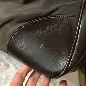 Prada large green nylon and brown leather commuter bowling bag satchel bag. Has Prada lock and 2 keys included. Zips great. Preowned with some color wear or discoloration on nylon. Green is a brownish color. Brown leather handles have small cracks on inside piping but very small. Some rubbing on bottom piping fans brown leather corners have some scratches and Knicks. Inside is green nylon with some discoloration of nylon. Has two zipper pockets and place for pens and two open pockets. Some wear on leather near zipper on one side.