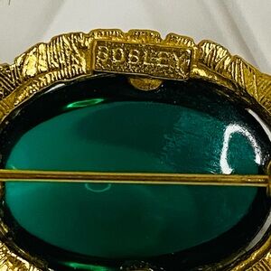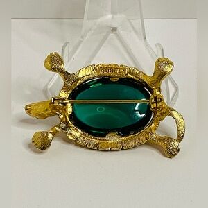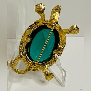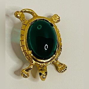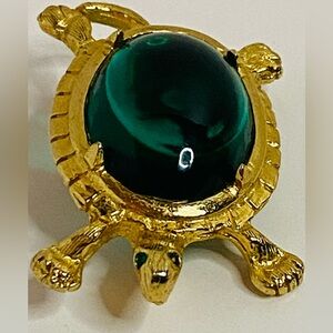 Vintage Joseph Bobley Elegant gold turtle brooch featuring a stunning green gem. Perfect accessory for any outfit.