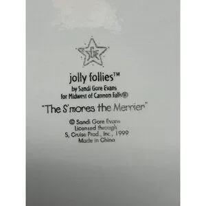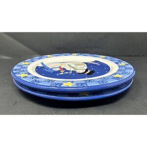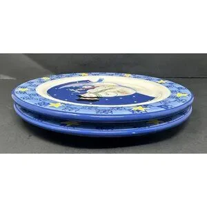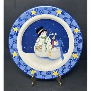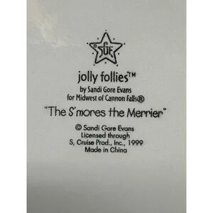 Adorable set of two (2) Jolly Follies dinner plates in The S’Mores the Merrier pattern – two snowmen roasting s’mores surrounded by a two-tone blue checkerboard border with gold stars. Designed by Sandi Gore Evans for Midwest of Cannon Falls. These endearing plates measure 10 1/8” across and 7/8 ” tall. Marking states “SGE [in a star] Jolly Follies ™ by Sandi Gore Evans for Midwest of Cannon Falls “The S’mores the Merrier” ©Sandi Gore Evans Licensed through S. Cruise Prod., 1999 Made in China.”