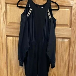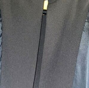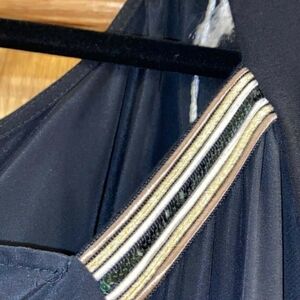 Jersey, sequins, embroidered detailing, solid color, round collar, 3/4 length sleeves, no pockets, high waisted, elasticized waist, rear closure, zip, stretch