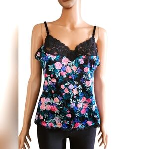 This camisole is in great shape with no stains or holes. It's black with a girly, floral design all over and trimmed in lace. The straps are adjustable