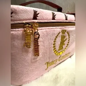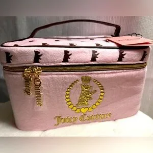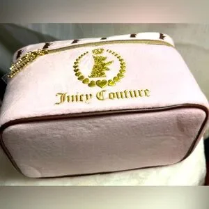 NEW Juicy Couture Travel Cosmetics Bag in pink felt. This super cute cosmetics bag comes with a metallic gold double zip around and brown faux leather finishes. The top on-the-go handle is great for travel use. Has a stunning gold Juicy Couture Logo on the front. Includes 1 toiletry bottle.