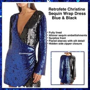 NWT Retrofete Christine Sequin Wrap Dress Blue and Black SZ LARGE $690