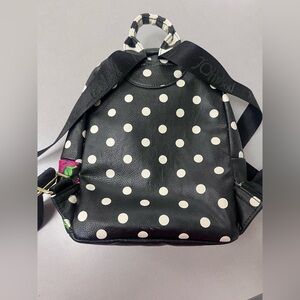 Betsey Johnson Mini Pink Roses Backpack with Black Bow, Gold Betsey Embellishments. Black and White Polka Dots on the Back. Iconic Betsey Lining on the Inside with One Pouch and One Zippered Compartment. Top Zip Closure. Approximately 10x11 inches.