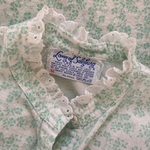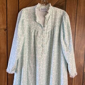 Very nice long soft cotton flannel nightgown with a ruffle hem in a green and white floral print and white eyelet trimming. Label says Made in USA with Love and shows some wear.