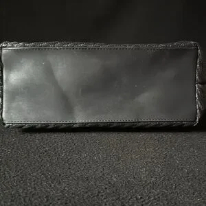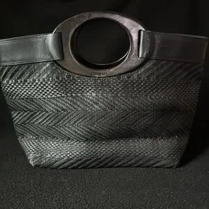 Cool black woven back with round wooden handles. Some signs of wear on one handle as pictured. Otherwise great conditioning. Clean interior. Snap flap closure . One zippered interior pocket. Great condition.