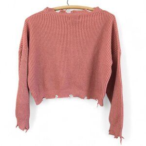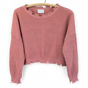Distressed Pink Knit Crop Sweater By Poof Apparel - Long Sleeve Crew Neck Large