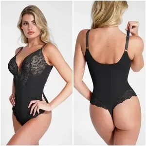 NWT Popilush Black Floral Lace Deep V Shapewear Thong Tummy Control Bodysuit