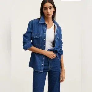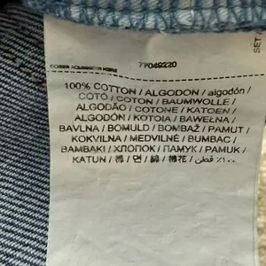 100% cotton. Denim style cotton fabric. Loops. Five pockets. Frayed hem. Button up.