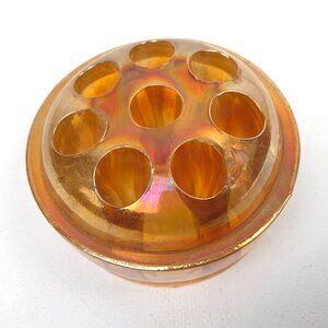Three Vintage Flower Frogs. Clear glass flower frog probably made in the 50s-60s, 7 holes, diameter 2.5". Good condition, minor wear scratches and a few manufacturing flaws in glass, but no chips or cracks. Vintage ceramic 2 tiered 9 holes frog in teal blue (unknown), diameter 2.75". Good condition. Vintage flower frog carnival glass marigold 8 holed iridescent domed, diameter 2.5". Fair condition, few chips around holes (please see last photo).