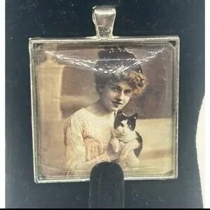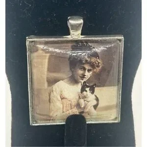Vintage Square Portrait Photo Women Holding Cat Silver Tone Pendant Victorian