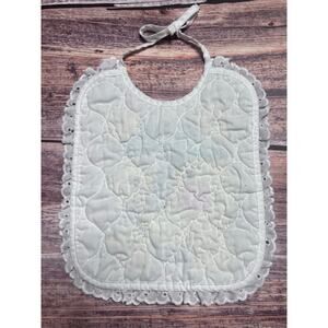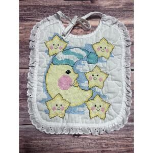 Handmade Moon Stars Cross Stitch Bib New or Like new condition. If you zoom in on the photo of the back you can see some darker stitches come through the white quilted fabric.