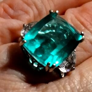 Electric Green Cushion Cut Emeraldine Triplet Quartz with White Topaz Half Moons in a Sterling Silver Rhodium Bond Ring