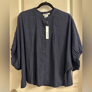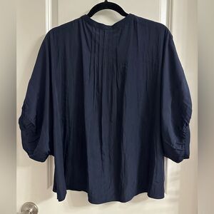 Chico’s Pintuck Dolman Sleeve Shirt Size 2.5 US 14 Cap Sleeve Neck Button Navy