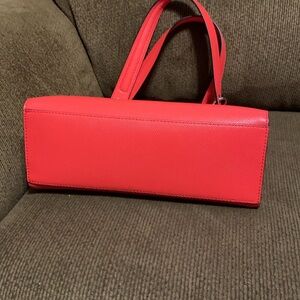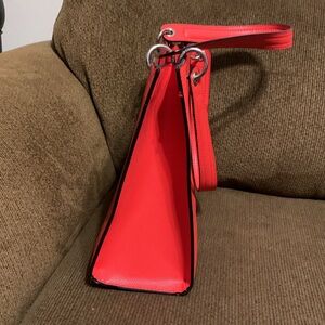Brand new..zip closure, zip compartment one side 3 slot compartments other side faux leather 12 inch across 11 inch height 5 inch width on bottom 8 1/2 inch handle