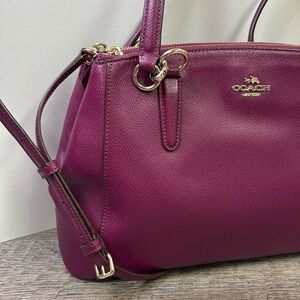 EXCELLENT, LIKE NEW CONDITION- FLAWLESS! Includes pictured dust bag. This beautiful and rare Coach Small Christie Carryall satchel bag comes in gorgeous purple color "Fuchsia". It's made from rich top quality textured polished grain leather and features two zippered compartments, gold tone signature hardware and logo details, and a signature hand tag. Superior quality craftsmanship with a sleek silhouette, attractive stitching and many other details gives this bag a unique and classy look. This satchel bag features main compartment with magnetic top closure and fully lined interior that includes a zippered back pocket and multifunctional utility slip-in pockets. Double handles with 8" drop, and long crossbody/shoulder strap offer versatile and comfortable carrying options.