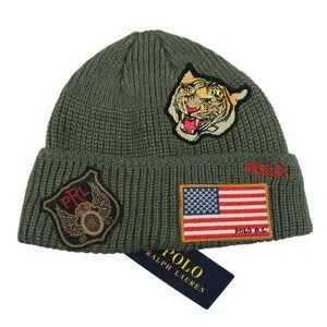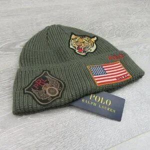 Polo Ralph Lauren Patch RL Tiger USA Flag Green Skull Ribbed Beanie Cap