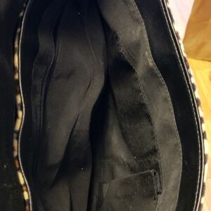 Excellent pre-owned condition faux fur leopard print purse with black faux leather trim, silvertone hardware and buckle snap closure. 15 in by 8 in with 3-in bottom gasket. Zip close pocket inside along with two other internal side pockets.