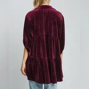fit/features: long half sleeves, front button up style, collared, ultra soft velvet velour style fabric, high waist / peplum waist, loose, relaxed fit, tunic length, polka dot pattern