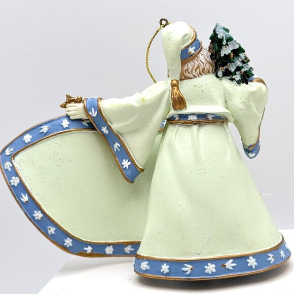 This exquisite Thomas Kinkade "Frosty Christmas Eve Santa" ornament, part of the Old World Santas collection, is from 2003, showcasing fine craftsmanship and elegant detail. Ideal for collectors, it features Santa in a beautifully painted cloak with a winter scene, capturing the warmth and charm of the holiday season.