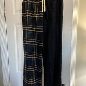 New with tags, Topshop multi-plaid wide leg trouser- two different but coordinating plaids and then on the other leg the plaid is reversed. Material is polyester but feels like flannel. Side pockets, unlined pants, front pleats. Length 44 inches