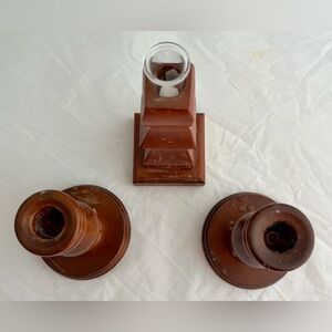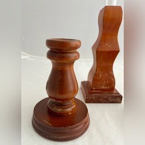 Each candle holder is small in size, making them perfect for use on any tabletop or mantelpiece. The wood-finished design adds a rustic touch to your home decor. These original, one-of-a-kind candle holders are perfect for collectors and are sure to add a touch of personality to any room.
