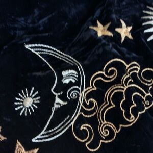 Embroidered stars, moons & suns, on black velvet~ really stunning.