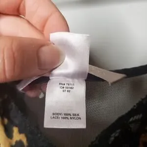 Inner hem (before it meets lace section) is a little unfinished as shown in photo; buyer could trim if desired, not very noticeable when wearing but wanted to point it out. Black trim in armpit areas shows a little discoloration. Good pre-owned vintage condition but silk has some minor runs, some are pointed out in photos. Expect light snags.