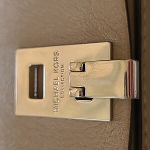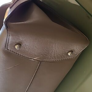 Rendered in soft, smooth calf leather, this structured shoulder bag by Michael Kors Collection brings a timeless top handle design into today. Beautiful dark taupe color with stud detail. In excellent condition, very minor creasing on front, and scratch on bottom (see photos).