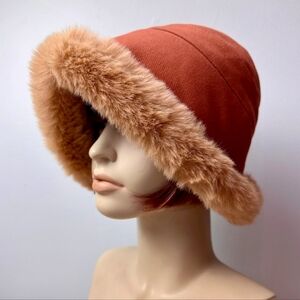 Unusual hood type hat from the 70’s fully lined with the softest shearling inside and along the brim. It’s like a sturdy cotton in a burnt orange or ceramic red color. The fur trim is incredibly soft. It’s in great original condition.