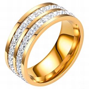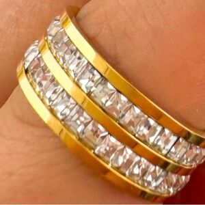 Ring 18K Gold Plated Over Stainless Steel With Cubic Zirconia. Hypoallergenic and waterproof high quality luxury style ring. New with tags. Choose 1: Size 6 or 7. Weight: 5 g.