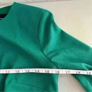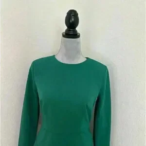 Jewel Neck, long sleeves, bust darts at waist seam, flap pockets at side hips and above the knee dress