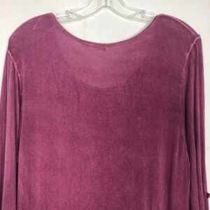 Magenta stonewash ruffle dress. Roll tab sleeves. Scoop neck. Please refer to measurements for size as this item does not have a tag attached. In good used condition. No visible flaws.