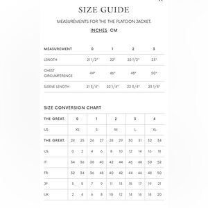 The GREAT. “The Platoon Jacket” new with tags - bought in NY flagship store but never worn. In perfect condition. Very flattering fit - almost like a swing jacket. Photos on model from The Great site don’t show how flattering it actually is - roomy but beautifully cut and not too long! Sold out online. Model is 5’7 and wearing same size as this one. Size 1 in The Great is supposed to be a “small” but I normally wear a size 12 jacket and this fits me well. I would say it is more like a Large or an oversized fit. I have measurements in photos and have included the official The Great measurements chart.