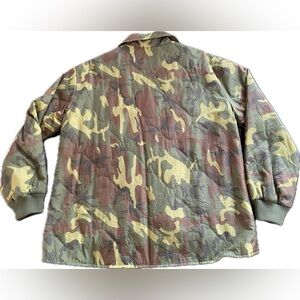 An homage to classic military styles. Crafted from lightweight, textured rib-stop nylon, adorned with a quintessential camo print, it offers a relaxed, boxy fit. The signature swingy hem, rounded shirttail hem, zip front, pointed collar, and rib cuffs add distinctive details. Lightly quilted with a classic onion stitch, it's ideal for cooler spring days. Elevate your look with this effortless blend of utility and contemporary.