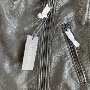 Motorcycle design, vegan leatherette fabric, leather-like seaming, all-black hardware, double lapels, zippered cuffs, zippered front pockets, a zippered extra upper pocket & zippered angled main closure. Snap closures at hem & lower lapels. Fully lined.