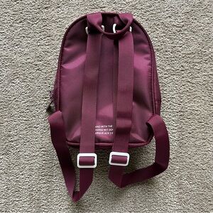 Mini burgundy backpack from Adidas. Main zipper compartment, interior pocket, small front zip compartment, and adjustable straps with white sliders. Maximum measurements are roughly 9.5” x 7” x 4”. The height can fit a standard plastic water bottle. New without tags.