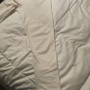 These leggings are a beautiful Ivory white hue and are shown in picture on a white comforter.