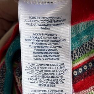 This is a soft, brightly colored pullover top from Chaps, ladies size Large. The knit fabric, 100% cotton, is an Aztec pattern in pink, purple, turquoise, red, yellow, lime green, and cream. Features a rounded, notched neckline and long sleeves. Just the thing to give a pop of color to your favorite jeans!
