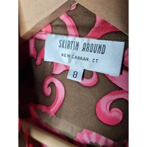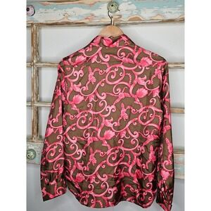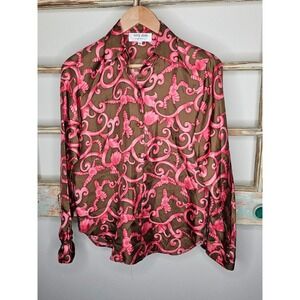 Skirtin Around brown blouse with ornate pink design in ladies size 8. This blouse measures 19.5" pit to pit and 26" in length. Comprised of polyester and a comfortable wear.