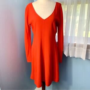 A beautiful red long sleeve fit and flare dress that can be worn different ways! Pair with elegant jewelry and heels for a look that can go to parties, special events or an evening out. Put on a blazer and some boots and you have a super chic work look! V-neck, long sleeves, front seaming and a hidden back zipper. The red has a slight orange tone to it and the material has a crepe-like feel. An older style, but a classic! In excellent used condition.
