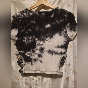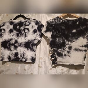 lot of 2 super cute cotton spandex blend, lightly ribbed, black & white short sleeve tye dye crop tops, never worn, both size medium. 1 of them is a bit more fitted and has sexy cut out detail on the sides