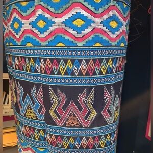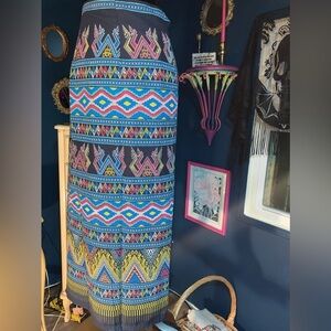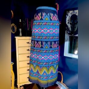 Blue/black wrap maxi skirt with abstract tribal pattern