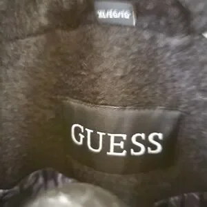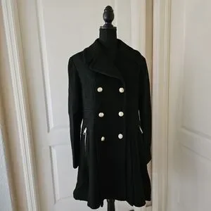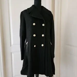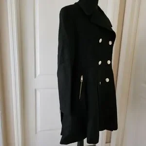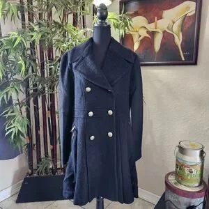 Guess Women's XL/EG/TG Peacoat Jacket Wool Blend Double Breasted, gold tone Milatery Button Up, 2 gold tone zipper pockets, gold tone zipper bottom sleeves.