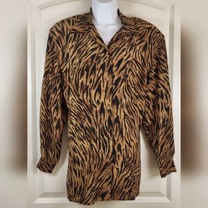 Vintage STUNT Silk Blouse Long Sleeve Button Up Brown Tiger Print Size Small