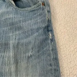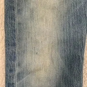 Some distressing at hemline where they were cut to fit over shoes and some wear on the front thighs