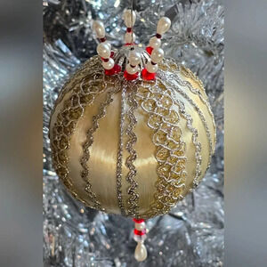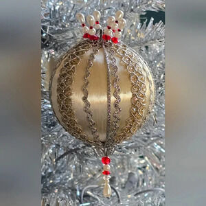 Beautiful Vintage Handmade Beaded Christmas Ornament | Silver Gold Red Pearl