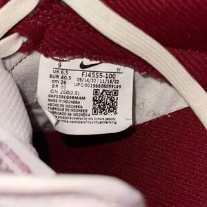 Color is a dark red burgundy and white with an off white sole. Very eye catching