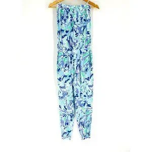 Style Tags: Lilly Pulitzer, women's jumpsuit, strapless jumpsuit, blue green purple print, rayon fabric, XS jumpsuit, abstract print, resort wear, spring fashion, trendy jumpsuit, casual outfit, breathable fabric, elastic waistband, ankle length, beachwear, vacation wear, designer, tropical, feminine, soft girl, stretchy, comfy