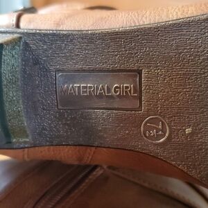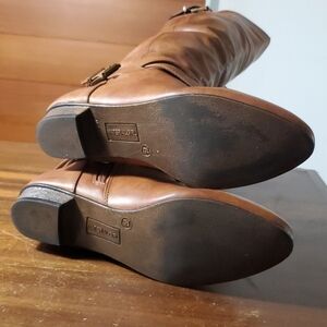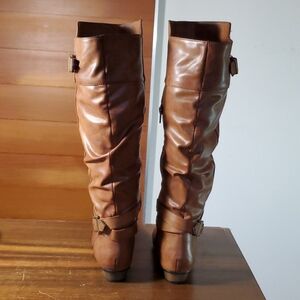Material Girl Size 7.5 Boots Over Knee Riding Flat Strappy Brown Tan Vegan Faux